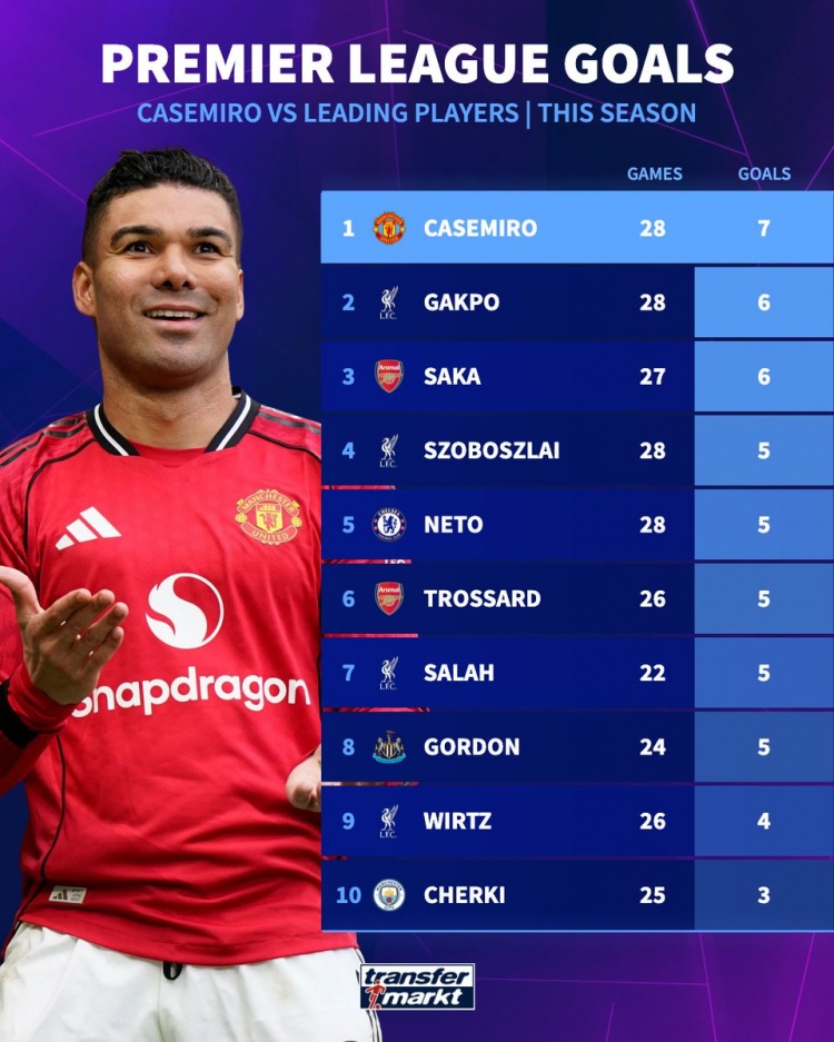 NBA直播-卡塞米罗本赛季英超打进7球,多于萨卡、萨拉赫、维尔茨等球员